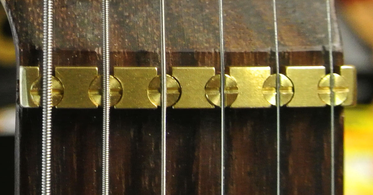 Aber – und das werdet ihr auch hören – sind die Unterschiede verdammt gering. Und wenn man dann bedenkt, dass nur ein Teil der gespielten Töne auf Leersaiten intoniert werden, dann erübrigt sich vielleicht schon die eine oder andere Diskussion ob der Wichtigkeit des einen oder anderen Materials. Und: Da der Klang einer Gitarre aus vielen Komponenten besteht, kann nicht von vornherein gesagt werden, welches Material nun das beste für das jeweilige System ist. Für eine höhenbetonte Konstruktion mit z. B. hartem Esche-Korpus und Ahorn-Hals samt Ahorn-Griffbrett kann z.B. ein etwas träger klingender Messingsattel die bessere Wahl sein.
